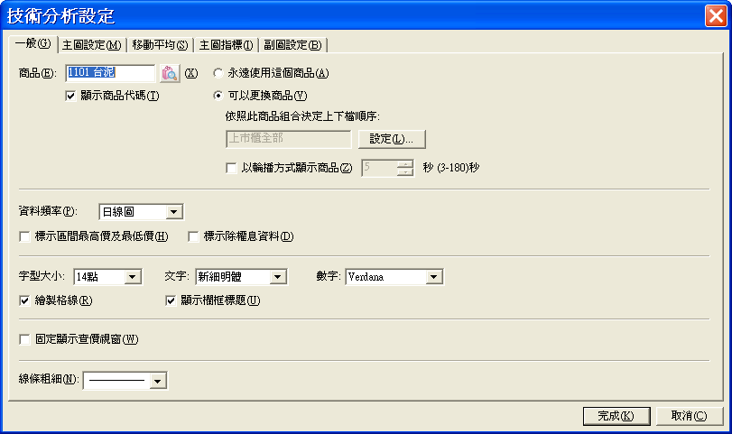 接著會跳出對話盒,相關設定分別列示在[一般]、[主圖設定]、[主圖指標]、[副圖設定]的Tab內,以供修改。依序說明如下。