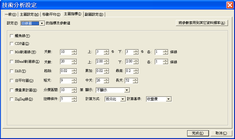 主圖指標:設定繪製於不同資料頻率主圖上的指標參數。(以