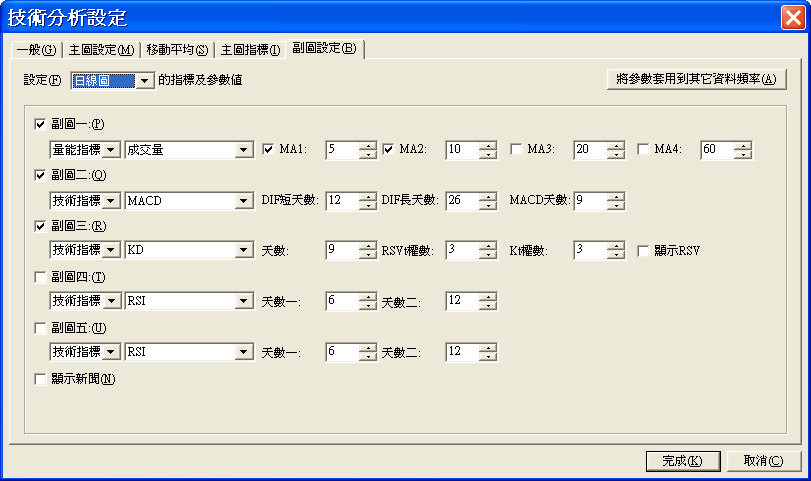 副圖設定:設定不同資料頻率的副圖技術指標及屬性。以