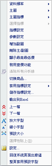在畫面上按滑鼠右鍵,會出現功能選單,可以切換資料頻率、主圖類型、副圖類型等項目。