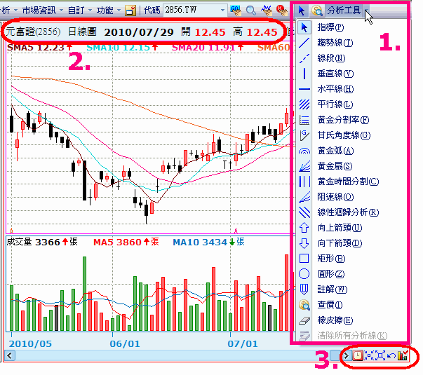 1.可利用工具列中的分析工具進行畫線分析,詳細功能,請參見: