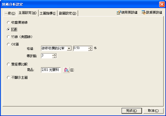 接著會跳出對話盒,相關設定分別列示在[一般]、[主圖設定]、[主圖指標]、[副圖設定]的Tab內,以供修改。依序說明如下。