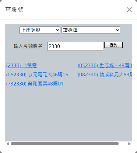 點選〔查股號〕按鈕會依所選市場彈出該市場的「股號查詢」小視窗,可以在小視窗選擇類股,再選取想要交易的股票,系統會把所點選的股票代碼帶到 下單介面的「輸入欄」內; 也可以在「輸入股號股名」欄輸入「股票名稱」或「股票代碼」,按下〔查詢〕按鈕,搜尋出所輸入的「股票名稱」及「股票代碼」。