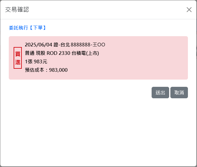 )按鈕,會彈出「交易確認」小視窗如下圖,按下〔送出〕鈕,即可送出委託;若按下〔取消〕鈕,則「取消」本筆委託。
