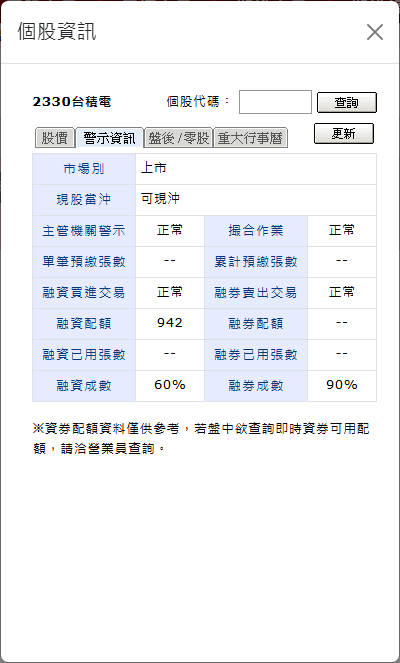 點選〔資訊〕按鈕會彈出「個股資料」小視窗,可以由「股價」、「警示資訊」、「盤後/零股」、「重大行事曆」頁籤,切換欲查詢的資料。