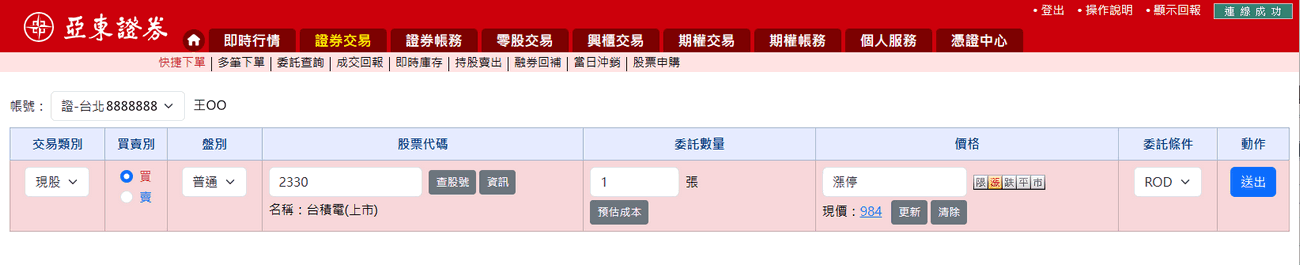 點選系統的〔證券交易〕按鈕,再點選〔快捷下單〕標籤。