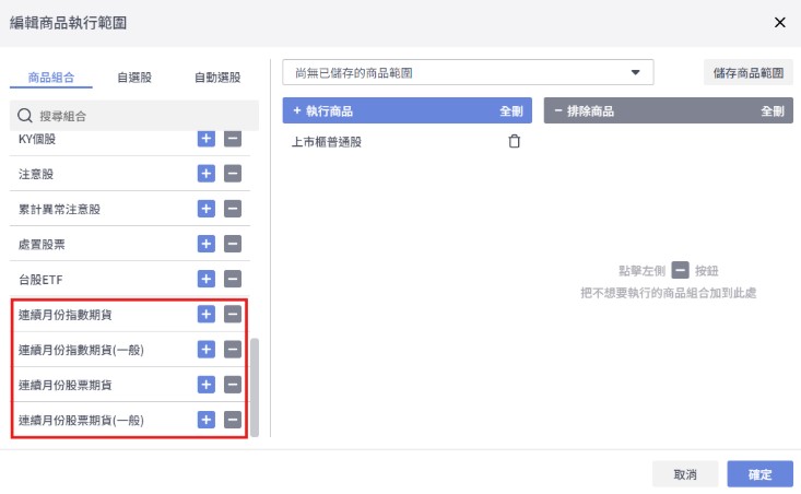 可以選擇 個股 / 期貨 / 小型期貨 / 微型期貨。 系統會持續監控這些清單裡的商品。 👉 小提醒:執行商品(A)必須要有成交量,後續條件才會生效。第二步:設定交易商品(C)