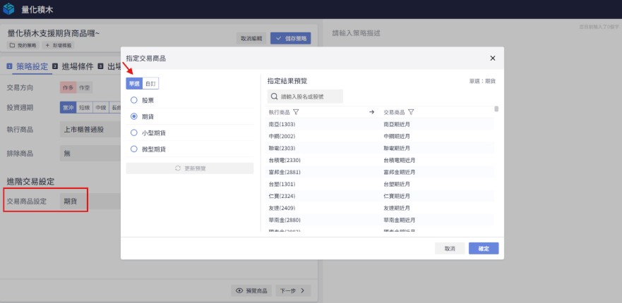 當進出場條件成立後,系統會依照你設定的「交易商品」來執行買賣。預設值是 股票,這次期貨版本還新增:- 期貨