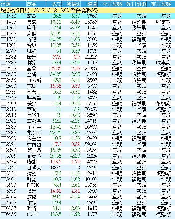 這個腳本可以找出最近一日訊號跟前一日不同的股票,以下幾張圖就是根據上述的腳本跑出來的,有的變好,有的變壞,加減參考囉。 101208101209101210101211