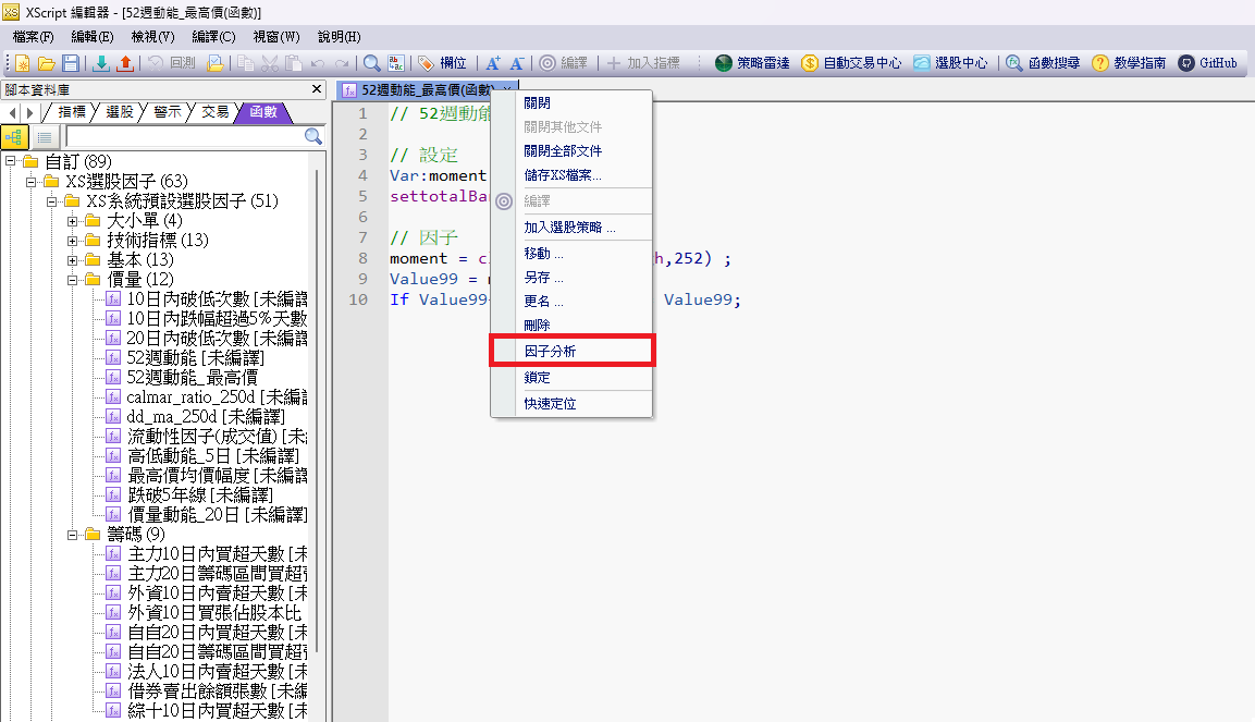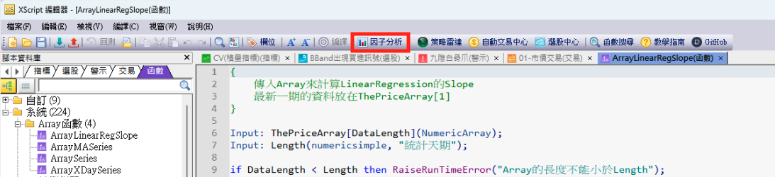 完成函數腳本編譯後,可在 XScript 中以下列三種方式開啟因子分析設定: