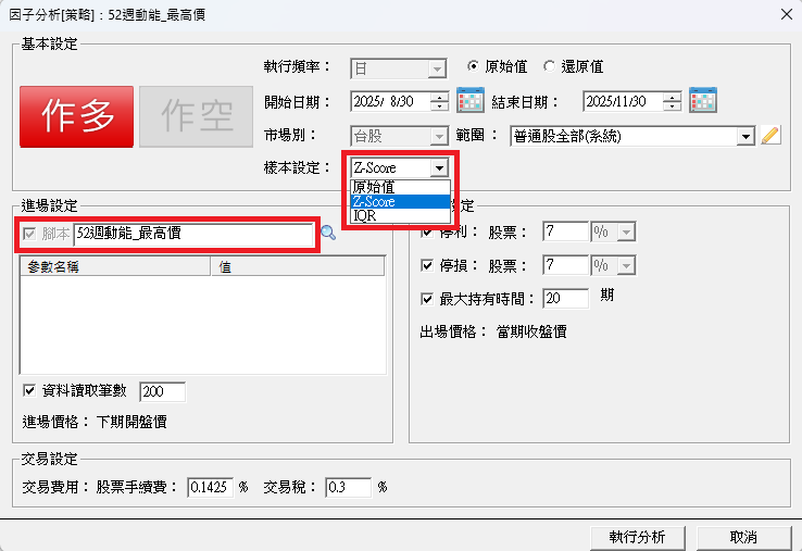 因子分析的參數設定與選股回測大致相同,以下針對不同點說明: