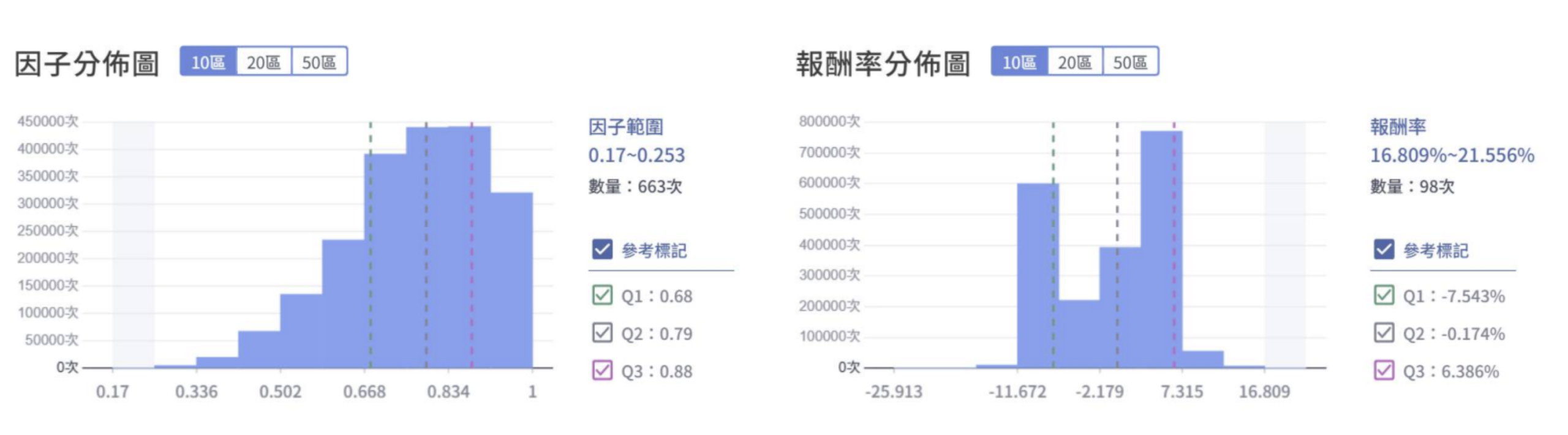 • 數據結構 「因子分布圖」用來診斷因子數值是否含有極端離群值,可透過此統計圖選擇合適的樣本調整方法;而「報酬率分布圖」則顯示各組報酬的集中度,幫助觀察獲利的穩定性與風險。
