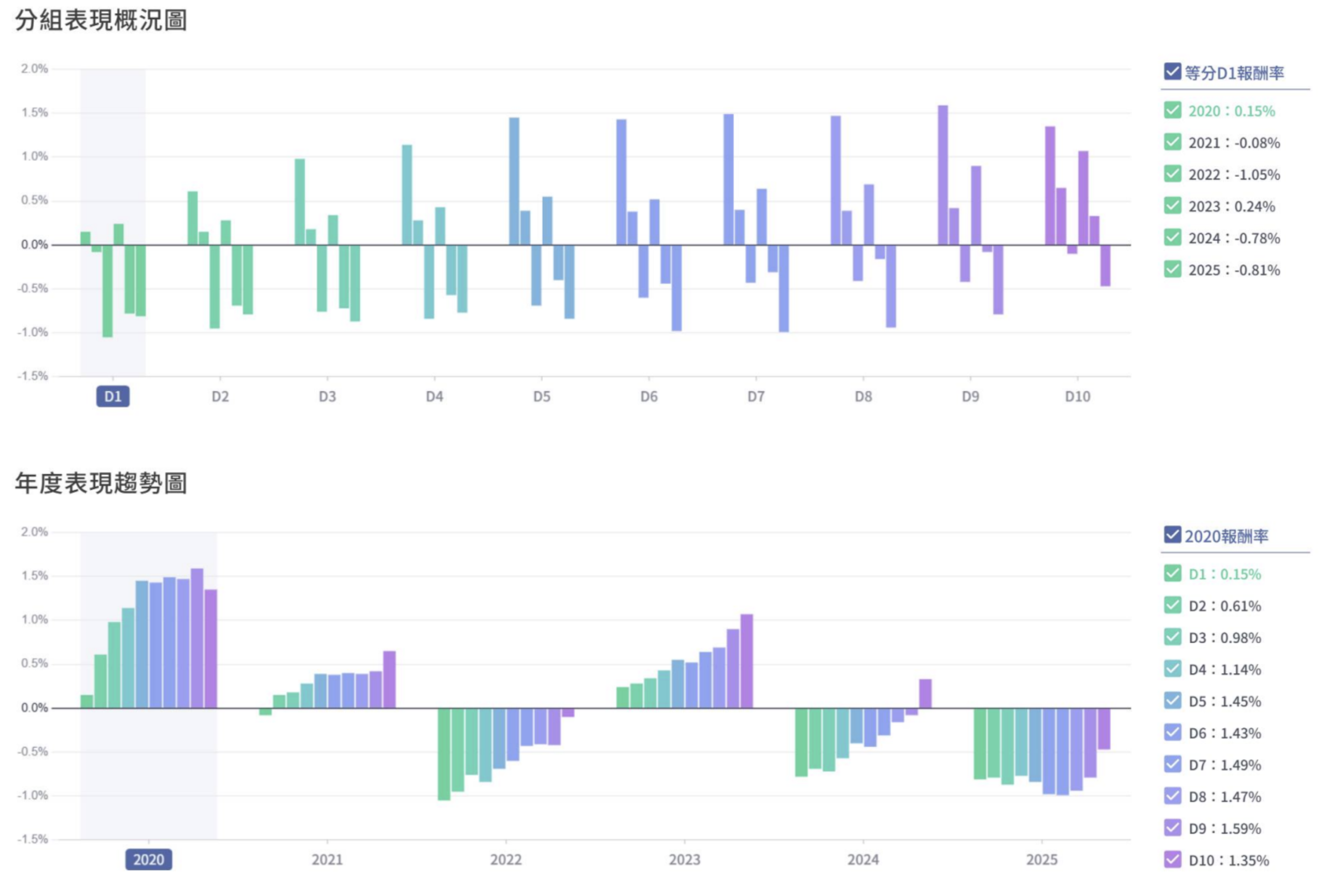 • 報酬穩定性 「分組表現概況圖」總結了各組的最終表現,而「年度表現趨勢圖」則從時間維度檢視因子是否在不同年度持續有效。