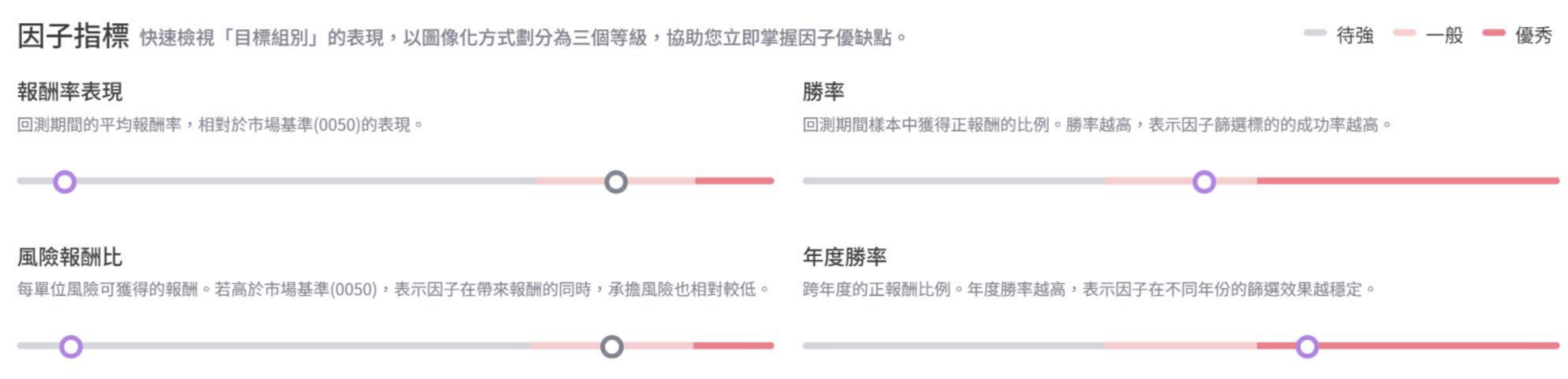 • 年度勝率:產生正報酬的年份比例,評估因子在不同年度中,是否普遍都有獲利能力。