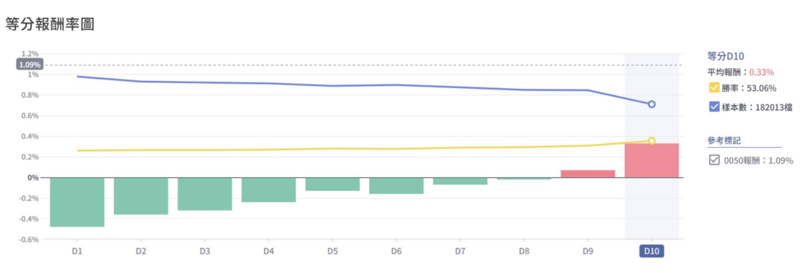 • 等分報酬率圖 是驗證因子是否有效的核心。 圖表中分 10 組 ( D1 至 D10 ) 的平均報酬率及勝率,理想的因子,我們應該看到第 1 組報酬率最低 ( 最高 ) ,第 10 組報酬率最高 ( 最低 ) ,且中間組別依序排列,代表因子有區分優劣股票的潛力。