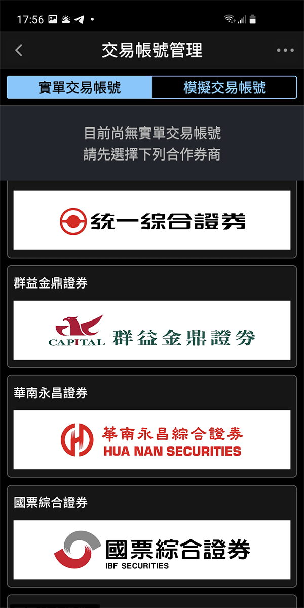 ※ 券商帳號不支援模擬交易,若需要此功能,建議申請XQ帳號後綁定券商下單。